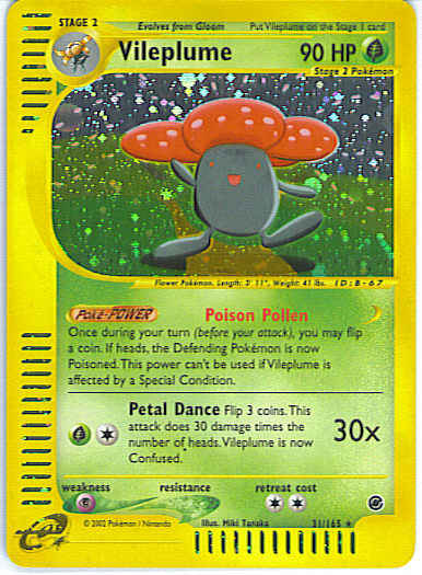 Type | Grass | Pokemon serie | Expedition | Stadie | Stage 2 | HP | 90 | Sjældenhed | Rare | Tilbagetrækning | 2 | Svaghed | P | Kortnummer | 31 | Evne |