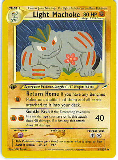Type | Fighting | Pokemon serie | Neo Destiny | Stadie | Stage 1 | HP | 80 | Sjældenhed | Uncommon | Tilbagetrækning | 2 | Svaghed | P | Kortnummer | 49 | Evne |