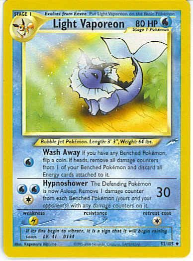 Type | Water | Pokemon serie | Neo Destiny | Stadie | Stage 1 | HP | 80 | Sjældenhed | Uncommon | Tilbagetrækning | 1 | Svaghed | L | Kortnummer | 52 | Evne |