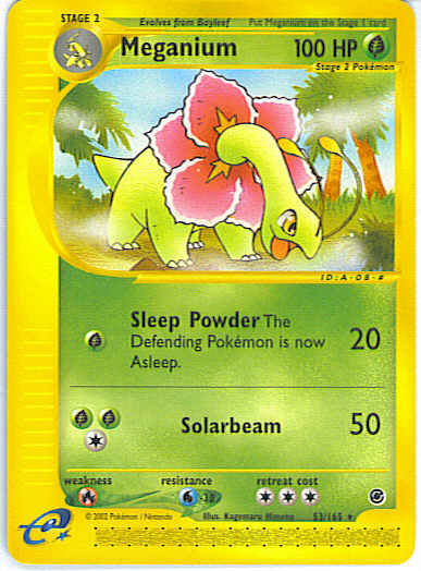 Type | Grass | Pokemon serie | Expedition | Stadie | Stage 2 | HP | 100 | Sjældenhed | Rare | Tilbagetrækning | 3 | Modstand | W | Svaghed | R | Kortnummer | 53 | Evne |