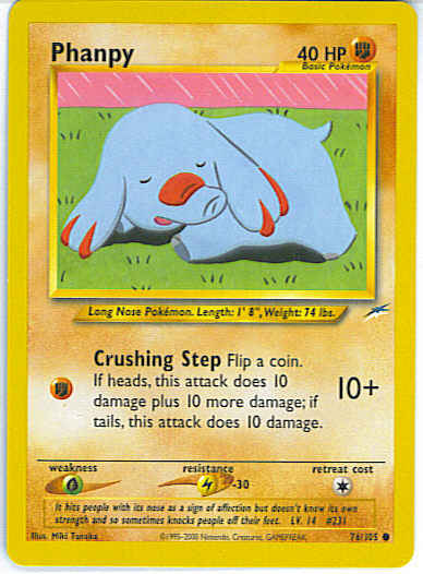 Type | Fighting | Pokemon serie | Neo Destiny | Stadie | Basic | HP | 40 | Sjældenhed | Common | Tilbagetrækning | 1 | Modstand | L | Svaghed | G | Kortnummer | 76 | Evne |