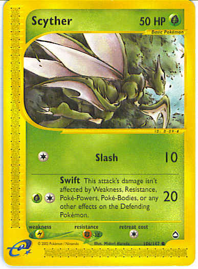 Type | Grass | Pokemon serie | Aquapolis | Stadie | Basic | HP | 50 | Sjældenhed | Common | Tilbagetrækning | 1 | Modstand | F | Svaghed | L | Kortnummer | 106 | Evne | [C] Slash (10) [CG] Swift (20) This attack's damage isn't affected by Weakness, Resistance, Poke-Powers, Poke-Bodies, or any other effects on the Defending Pokemon.
