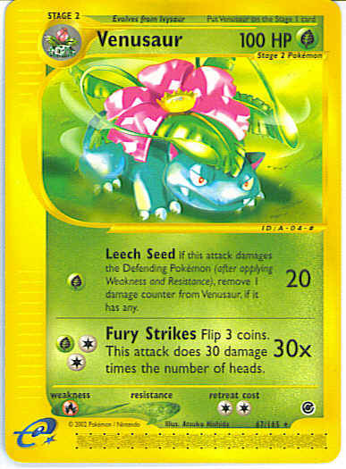 [G] Leech Seed (20) If this attack damages the Defending Pokemon (after applying Weakness and Resistance), remove 1 damage counter from Venusaur, is it has any.