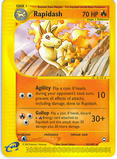 Type | Fire | Pokemon serie | Aquapolis | Stadie | Stage 1 | HP | 70 | Sjældenhed | Rare | Svaghed | W | Kortnummer | 31 | Evne | [CC] Agility (10) Flip a coin. If heads, prevent all effects of attacks, including damage, done to Rapidash during your opponent's next turn. [CCR] Gallop (30+) Flip a coin. If heads, this attack does 30 damage plus 20 more damage and you discard 1 R Energy card attached to Rapidash.