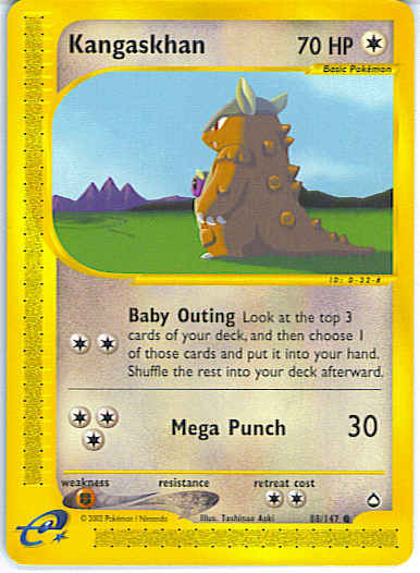 Type | Colorless | Pokemon serie | Aquapolis | Stadie | Basic | HP | 70 | Sjældenhed | Common | Tilbagetrækning | 2 | Svaghed | F | Kortnummer | 88 | Evne | [CC] Baby Outing - Look at the top 3 cards of your deck. Put 1 of those cards in your hand and shuffle the rest into your deck. [CCC] Mega Punch (30)