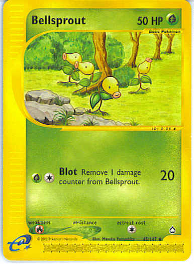 Type | Grass | Pokemon serie | Aquapolis | Stadie | Basic | HP | 50 | Sjældenhed | Uncommon | Tilbagetrækning | 1 | Svaghed | R | Kortnummer | 45 | Evne | [CG] Blot (20) Remove 1 damage counter from Bellsprout, if any.