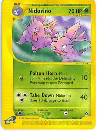 Type | Grass | Pokemon serie | Aquapolis | Stadie | Stage 1 | HP | 70 | Sjældenhed | Uncommon | Tilbagetrækning | 1 | Svaghed | P | Kortnummer | 55 | Evne | [G] Poison Horn (10) Flip a coin. If heads, the Defending Pokemon is now Poisoned. [CCC] Take Down (40) Nidorino does 10 damage to itself.