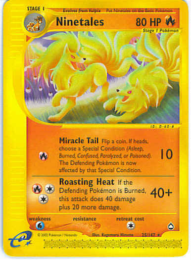 Type | Fire | Pokemon serie | Aquapolis | Stadie | Stage 1 | HP | 80 | Sjældenhed | Rare | Tilbagetrækning | 1 | Svaghed | W | Kortnummer | 25 | Evne | [R] Miracle Tail (10) Flip a coin. If heads, choose 1 Special Condition. The Defending is now affected by that Special Condition. [CCR] Roasting Heat (40+) If the Defending Pokemon is Burned, this attack does 40 damage plus 20 more damage.