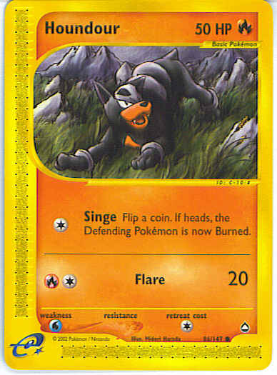 Type | Fire | Pokemon serie | Aquapolis | Stadie | Basic | HP | 50 | Sjældenhed | Common | Tilbagetrækning | 1 | Svaghed | W | Kortnummer | 86 | Evne | [C] Singe - Flip a coin. If heads, the Defending Pokemon is now Burned. [CR] Flare (20)