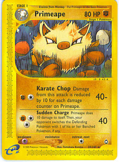 Type | Fighting | Pokemon serie | Aquapolis | Stadie | Stage 1 | HP | 80 | Sjældenhed | Rare | Tilbagetrækning | 1 | Svaghed | P | Kortnummer | 29 | Evne | [CF] Karate Chop (40-) Does 40 damage minus 10 damage for each damage counter on Primeape. [CCF] Sudden Charge (40) Primeape does 10 damage to itself. Your opponent switches the Defending Pokemon with 1 of his or her Benched Pokemon, if any. (Do the damage before switching the Pokemon.)