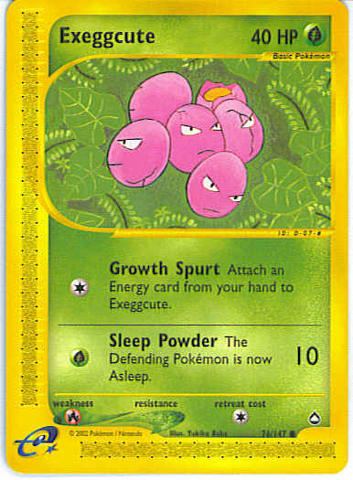 Type | Grass | Pokemon serie | Aquapolis | Stadie | Basic | HP | 40 | Sjældenhed | Common | Tilbagetrækning | 1 | Svaghed | R | Kortnummer | 76 | Evne | [C] Growth Spurt - If there are any G Energy cards in your hand, choose 1 of them and attach it to Exeggcute. [G] Sleep Powder (10) The Defending Pokemon is now Asleep.
