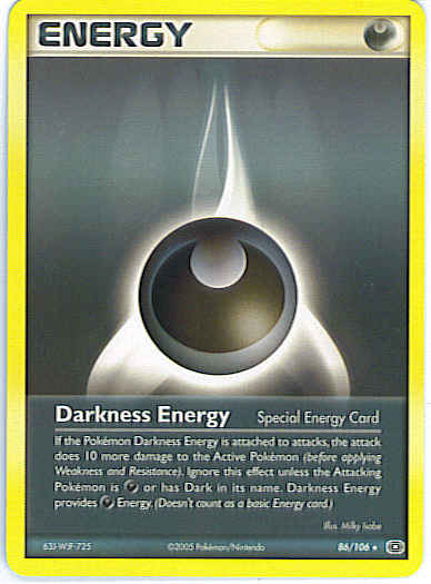 If the Pokemon Darkness Energy is attached to attacks, the attack does 10 more damage to the Active Pokemon (before applying Weakness and Resistance). Ignore this effect unless the Attacking Pokemon is D or has Dark in its name. Darkness Energy provides D energy. (Doesn't count as a basic Energy card.)
