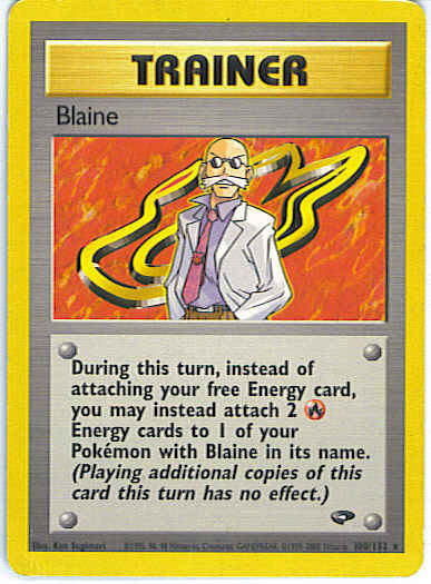 During this turn, instead of attaching your free Energy card, you may instead attach 2 R Energy cards to 1 of your Pokemon with Blaine in its name. (Playing additional copies of this card this turn has no effect.)