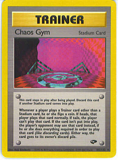 Whenever a player plays a Trainer card other than a Stadium card, he or she flips a coin. If heads, that player plays that card normally. If tails, the player can't play that card. If the card isn't put into play, the player's opponent may use that card instead, if he or she does everything required in order to play that card (like discarding cards). Either way, the card goes to its owner's discard pile.