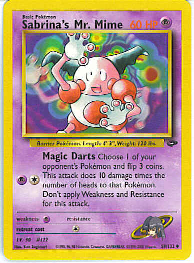 Type | Psychic | Pokemon serie | Gym Challenge | Stadie | Basic | HP | 60 | Sjældenhed | Uncommon | Tilbagetrækning | 1 | Svaghed | P | Kortnummer | 59 | Evne |