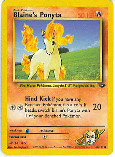 [CC] Hind Kick (20) If you have any Benched Pokemon, flip a coin. If heads, switch Blaine's Ponyta with 1 of your Benched Pokemon.