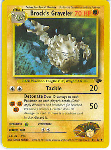 [FFF] Detonate (50) Does 10 damage to each Pokemon on each player's bench. (Don't apply Weakness and Resistance for Benched Pokemon.) Brock's Graveler does 50 damage to itself. If there is a Stadium card in play, discard it.