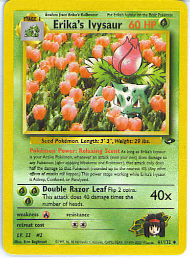 Type | Grass | Pokemon serie | Gym Challenge | Stadie | Stage 1 | HP | 60 | Sjældenhed | Uncommon | Tilbagetrækning | 2 | Svaghed | R | Kortnummer | 41 | Evne | of attacks still happen.) This power stops working while Erika's Ivysaur is Asleep, Confused, or Paralyzed.