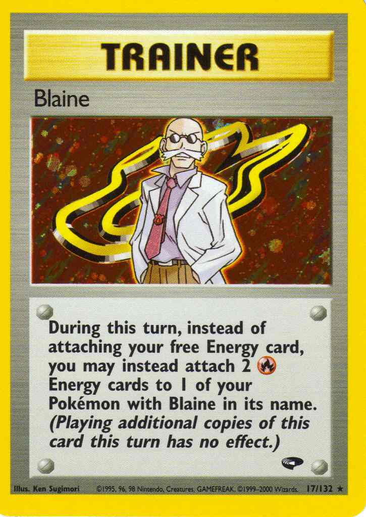 Evne During this turn, instead of attaching your free Energy card, you may instead attach 2 R Energy cards to 1 of your Pokemon with Blaine in its name. (Playing additional copies of this card this turn has no effect.)
