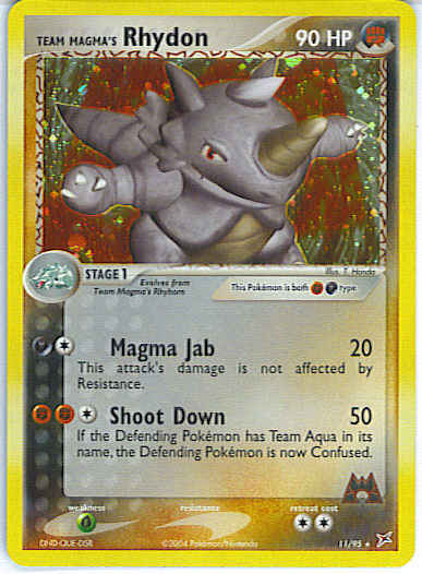 Type | Darkness Fighting | Pokemon serie | Team Aqua-Team Magma | Stadie | Stage 1 | HP | 90 | Sjældenhed | Rare | Tilbagetrækning | 2 | Svaghed | G | Kortnummer | 11 | Evne | [CD] Magma Jab (20) This attack's damage is not affected by Resistance. [CFF] Shoot Down (50) If the Defending Pokemon has Team Aqua in its name, the Defending Pokemon is now Confused.