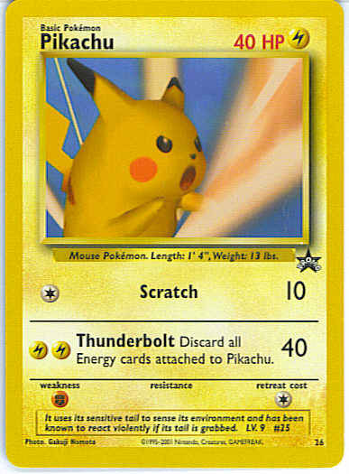 Type | Lightning | Pokemon serie | WoTC Promo | Stadie | Basic | HP | 40 | Sjældenhed | Promo | Tilbagetrækning | 1 | Svaghed | F | Kortnummer | 26 | Evne |
