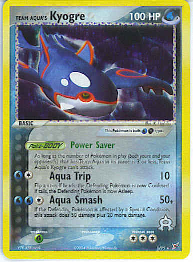 Type | Darkness Water | Pokemon serie | Team Aqua-Team Magma | Stadie | Basic | HP | 100 | Sjældenhed | Rare | Tilbagetrækning | 3 | Svaghed | G | Kortnummer | 3 | Evne | [CW] Aqua Trip (10) Flip a coin. If heads, the Defending Pokemon is now Confused. If tails, the Defending Pokemon is now Asleep. [CWW] Aqua Smash (50+) If the Defending Pokemon is affected by a Special Condition, this attack does 50 damage plus 20 more damage.
