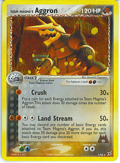 | Evne2 | [F] Crush (30x) Flip a coin for each Energy attached to Team Magma's Aggron. This attack does 30 damage times the number of heads. [CCFF] Land Stream (50+) You may discard any number of basic Energy cards attached to Team Magma's Aggron. If you do, this attack does 50 damage plus 20 more damage for each basic Energy card you discarded.