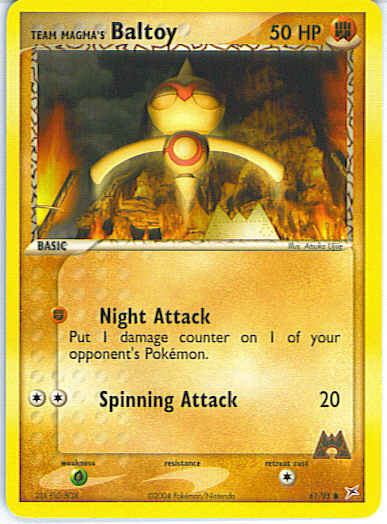 Type | Fighting | Pokemon serie | Team Aqua-Team Magma | Stadie | Basic | HP | 50 | Sjældenhed | Common | Tilbagetrækning | 1 | Svaghed | G | Kortnummer | 61 | Evne | [F] Night Attack - Put 1 damage counter on 1 of your opponent's Pokemon. [CC] Spinning Attack (20)
