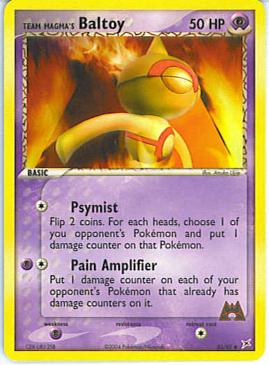 Type | Psychic | Pokemon serie | Team Aqua-Team Magma | Stadie | Basic | HP | 50 | Sjældenhed | Uncommon | Tilbagetrækning | 1 | Svaghed | P | Kortnummer | 32 | Evne | [C] Psymist - Flip 2 coins. For each heads, choose 1 of your opponent's Pokemon and put 1 damage counter on that Pokemon. [CP] Pain Amplifier - Put 1 damage counter on each of your opponent's Pokemon that already has damage counters on it.