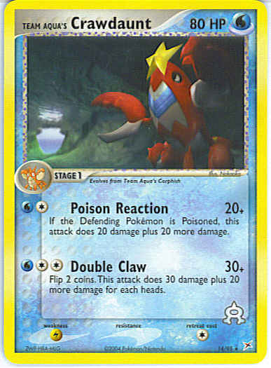 Type | Water | Pokemon serie | Team Aqua-Team Magma | Stadie | Stage 1 | HP | 80 | Sjældenhed | Rare | Tilbagetrækning | 1 | Svaghed | L | Kortnummer | 14 | Evne | [CW] Poison Reaction (20+) If the Defending Pokemon is Poisoned, this attack does 20 damage plus 20 more damage. [CCW] Double Claw (30+) Flip 2 coins. This attack does 30 damage plus 20 more damage for each heads.