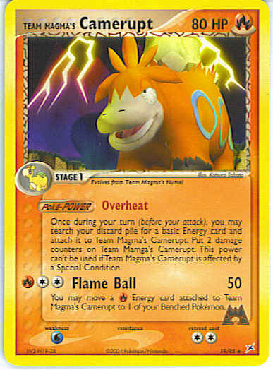 Type | Fire | Pokemon serie | Team Aqua-Team Magma | Stadie | Stage 1 | HP | 80 | Sjældenhed | Rare | Tilbagetrækning | 2 | Svaghed | W | Kortnummer | 19 | Evne | [CCR] Flame Ball (50) You may move a R Energy card attached to Team Magma's Camerupt to 1 of your Benched Pokemon.