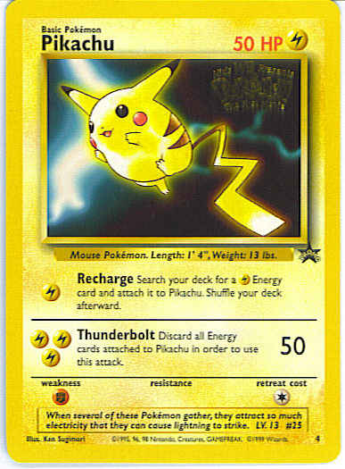 Type | Lightning | Pokemon serie | WoTC Promo | Stadie | Basic | HP | 50 | Sjældenhed | Promo | Tilbagetrækning | 1 | Svaghed | F | Kortnummer | 4 | Evne |