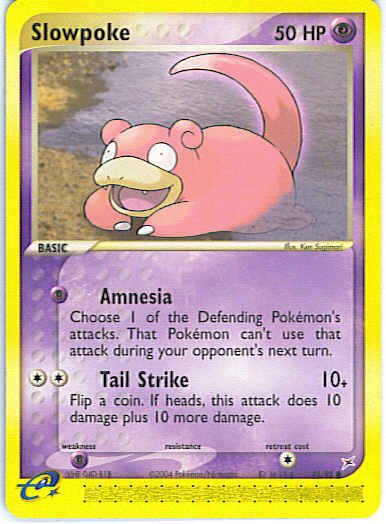 Type | Psychic | Pokemon serie | Team Aqua-Team Magma | Stadie | Basic | HP | 50 | Sjældenhed | Common | Tilbagetrækning | 1 | Svaghed | P | Kortnummer | 45 | Evne | [P] Amnesia - Choose 1 of the Defending Pokemon's attacks. That Pokemon can't use that attack during your opponent's next turn. [CC] Tail Strike (10+) Flip a coin. If heads, this attack does 10 damage plus 10 more damage.