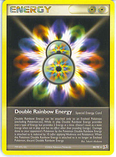Type | Energy | Pokemon serie | Team Aqua-Team Magma | Stadie | Special Energy | Sjældenhed | Uncommon | Kortnummer | 88 | Evne | Double Rainbow Energy can be attached only to an Evolved Pokemon (excluding Pokemon-ex). While in play, Double Rainbow Energy provides every type of Energy but provides 2 Energy at a time. (Doesn't count as a basic Energy when not in play and has no effect other than providing Energy.) Damage done to your opponent's Pokemon by the Pokemon Double Rainbow Energy is attached to is reduced by 10 (after applying Weakness and Resistance). When the Pokemon Double Rainbow Energy is attached to is no longer an Evolved Pokemon, discard Double Rainbow Energy.
