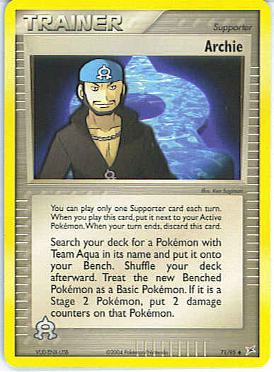 Type | Trainer | Pokemon serie | Team Aqua-Team Magma | Stadie | Trainer (Supporter) | Sjældenhed | Uncommon | Kortnummer | 71 | Evne | Search your deck for a Pokemon with Team Aqua in its name and put it onto your Bench. Shuffle your deck afterward. Treat the new Benched Pokemon as a Basic Pokemon. If it is a Stage 2 Pokemon, put 2 damage counters on that Pokemon.