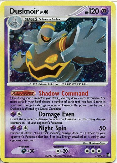 [CPP] Night Spin (50) Prevent all effects of an attack, including damage, done to Dusknoir by your opponent's Pokemon that has 2 or less Energy attached to it during your opponent's next turn.