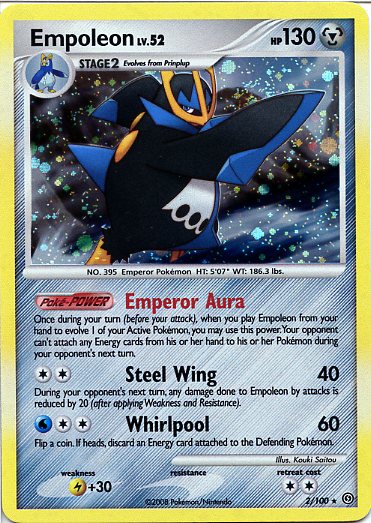 Evne [CC] Steel Wing (40) During your opponent's next turn, any damage done to Empoleon by attacks is reduced by 20 (after applying Weakness and Resistance).