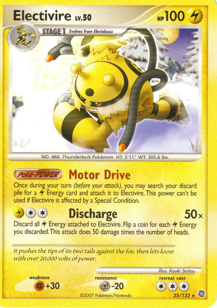 Evne [CCL] Discharge (50x) Discard all L Energy attached to Electivire. Flip a coin for each L Energy you discarded. This attack does 50 damage times the number of heads.