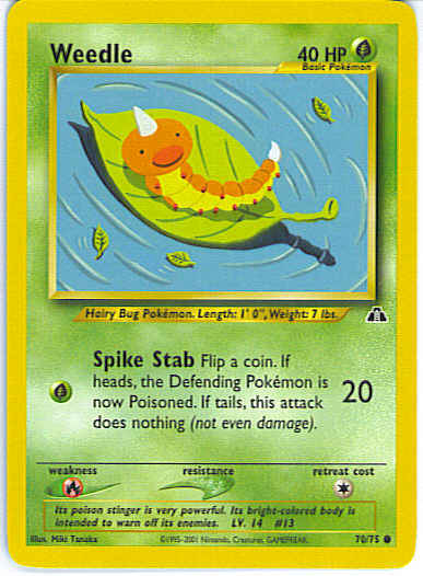 Type | Grass | Pokemon serie | Neo Discovery | Stadie | Basic | HP | 40 | Sjældenhed | Common | Tilbagetrækning | 1 | Svaghed | R | Kortnummer | 70 | Evne |