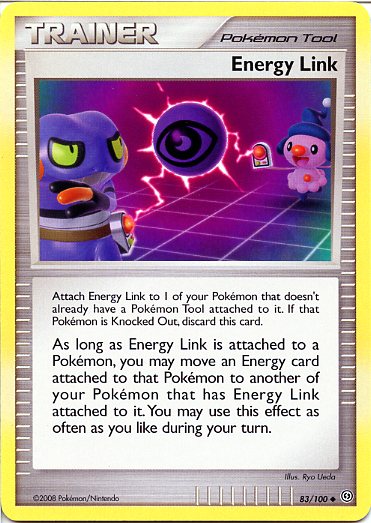 As long as Energy Link is attached to a Pokemon, you may move an Energy card attached to that Pokemon to another of your Pokemon that has Energy Link attached to it. You may use this effect as often as you like during your turn.