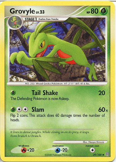 Type | Grass | Pokemon serie | Stormfront | Stadie | Stage 1 | HP | 80.0 | Sjældenhed | Uncommon | Tilbagetrækning | 1.0 | Modstand | W-20 | Svaghed | R+20 | Kortnummer | 39 | Evne | [G] Tail Shake (20) The Defending Pokemon is now Asleep. [CCG] Slam (60x) Flip 2 coins. This attack does 60 damage times the number of heads.