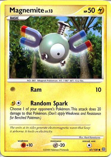Type | Lightning | Pokemon serie | Stormfront | Stadie | Basic | HP | 50.0 | Sjældenhed | Common | Tilbagetrækning | 1.0 | Modstand | M-20 | Svaghed | F+10 | Kortnummer | 67 | Evne |