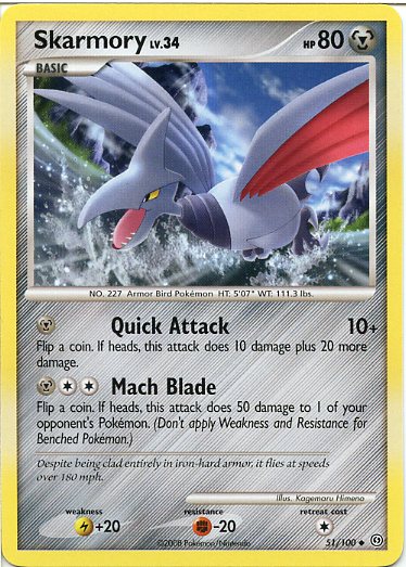 Type | Metal | Pokemon serie | Stormfront | Stadie | Basic | HP | 80.0 | Sjældenhed | Uncommon | Tilbagetrækning | 1.0 | Modstand | F-20 | Svaghed | L+20 | Kortnummer | 51 | Evne | [M] Quick Attack (10+) Flip a coin. If heads, this attack does 10 damage plus 20 more damage. [CCM] Mach Blade - Flip a coin. If heads, this attack does 50 damage to 1 of your opponent's Pokemon. (Don't apply Weakness and Resistance for Benched Pokemon.)