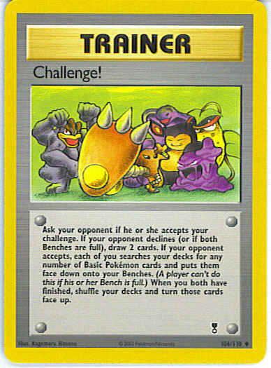 Ask your opponent if he or she accepts your challenge. If your opponent declines (or if both Benches are full), draw 2 cards. If your opponent accepts, each of you searches your decks for any number of Basic Pokemon cards and puts them face down onto your Benches. (A player can't do this if his or her Bench is full.) When you both have finished, shuffle your decks and turn those cards face up.