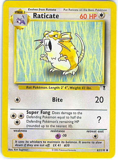 Type | Colorless | Pokemon serie | Legendary Collection | Stadie | Stage 1 | HP | 60 | Sjældenhed | Uncommon | Tilbagetrækning | 1 | Modstand | P | Svaghed | F | Kortnummer | 61 | Evne |