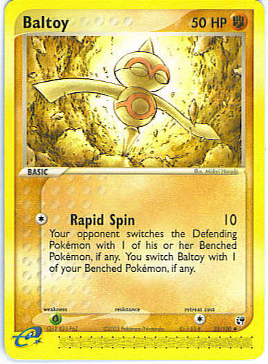 Evne[C] Rapid Spin (10) Your opponent switches the Defending Pokemon with 1 of his or her Benched Pokemon, if any. You switch Baltoy with 1 of your Benched Pokemon, if any.