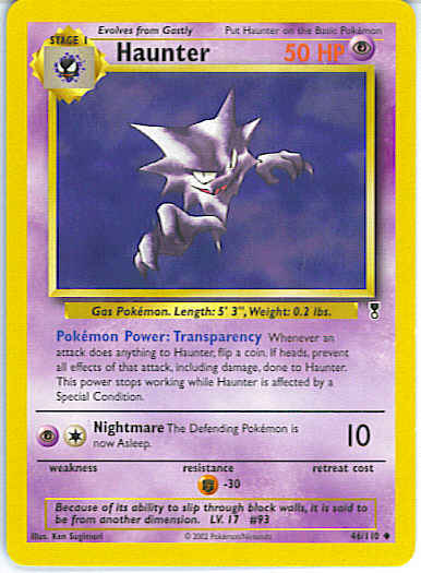 Type | Psychic | Pokemon serie | Legendary Collection | Stadie | Stage 1 | HP | 50 | Sjældenhed | Uncommon | Modstand | F | Kortnummer | 46 | Evne | of that attack, including damage, done to Haunter. This power stops working while Haunter is Asleep.