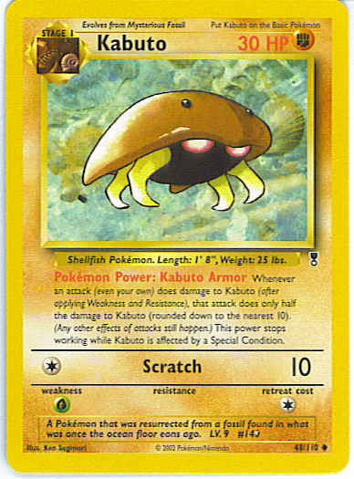 Type | Fighting | Pokemon serie | Legendary Collection | Stadie | Stage 1 | HP | 30 | Sjældenhed | Uncommon | Tilbagetrækning | 1 | Svaghed | G | Kortnummer | 48 | Evne | of attacks still happen.) This power stops working while Kabuto is Asleep, Confused, or Paralyzed.