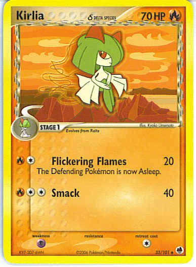 Type | Fire | Pokemon serie | Dragon Frontiers | Stadie | Stage 1 | HP | 70 | Sjældenhed | Uncommon | Tilbagetrækning | 1 | Svaghed | P | Kortnummer | 33 | Evne | [CR] Flickering Flames (20) The Defending Pokemon is Asleep. [CCR] Smack (40)