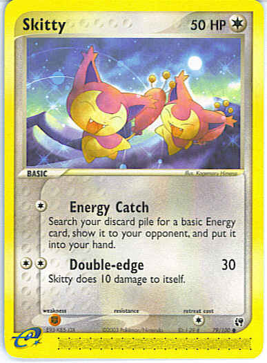 Type | Colorless | Pokemon serie | Sandstorm | Stadie | Basic | HP | 50 | Sjældenhed | Common | Tilbagetrækning | 1 | Svaghed | F | Kortnummer | 79 | Evne | [L] Energy Catch - Search your discard pile for a basic Energy card, show it to your opponent, and put it into your hand. [CC] Double Edge (30) Skitty does 10 damage to itself.